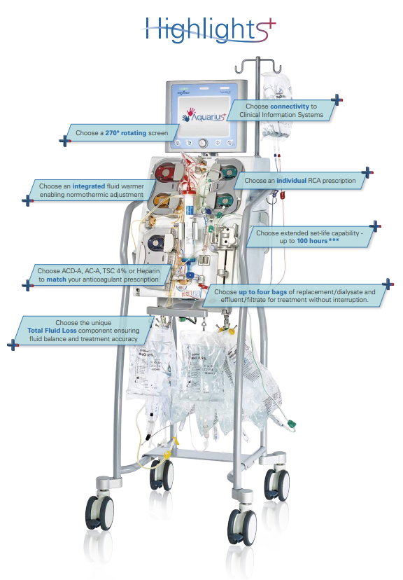 Aquarius+™ představuje pokročilý CRRT systém nové generace, navržený pro použití na jednotkách intenzivní péče a v kritické péči. Navazuje na osvědčenou platformu Aquarius™ a dále rozšiřuje možnosti přesné, stabilní a individualizované terapie u pacientů se selháním ledvin.